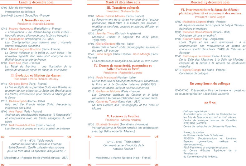 Colloque international organisé par le Centre de musique baroque de Versailles, l’Association pour un Centre de Recherche sur les Arts du Spectacle aux XVIIe et XVIIIe siècles, le Centre de recherche du château de Versailles, avec le soutien de l’université Paris-Sorbonne (équipes « Représentations et Identités. Espaces germanique, nordique et néerlandophone » et « Patrimoines et Langages Musicaux »), du Centre d’Études Supérieures de la Renaissance de l’université François-Rabelais de Tours et du Centre national de la danse.