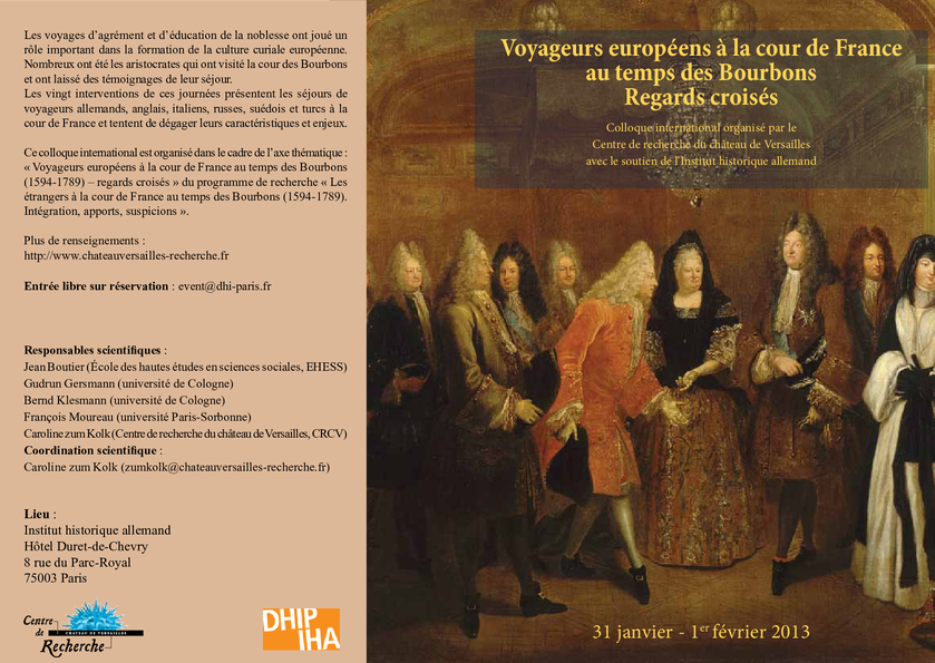 Colloque organisé par le Centre de recherche du château de Versailles avec le soutien de l’Institut historique allemand Paris, dans le cadre du programme de recherche « Les étrangers à la cour de France au temps des Bourbons (1594-1789). Stratégies, apports, suspicions » mené par le Centre de recherche, plus précisément dans le cadre de l’axe thématique consacré aux voyageurs.