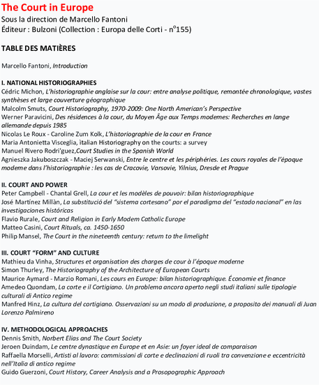 Publication of papers from the international symposium Les cours en Europe : bilan historiographique (Versailles, 24-26 September 2009), directed by Marcello Fantoni, Editore Bulzoni (“Europa delle Corti” Collection), 2012, 17 x 24 cm, 498 p., €37 (ISBN: 978-88-7870-648-4).