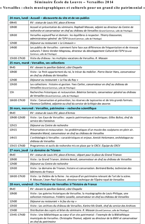 Destiné à une vingtaine d’élèves de l’École du Louvre, ce séminaire alterne exposés de spécialistes et visites du site de Versailles sur le thème « Versailles : choix muséographiques et culturels pour un grand site patrimonial ». Il se déroule du 24 au 28 mars 2014.