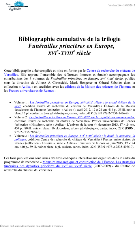 Les funérailles princières en Europe, XVIe-XVIIIe siècle : le deuil, la mémoire, la politique (publication issue du colloque international des 26 et 27 novembre 2009 à Versailles et du 28 novembre 2009 à Saint-Denis), sous la dir. de Juliusz A. Chrościcki, Mark Hengerer, Gérard Sabatier, coédition Centre de recherche du château de Versailles / Presses universitaires de Rennes, coll. « Histoire », série « Aulica – L’Univers de la cour », juin 2015, 17 x 24 cm, 440 p., 39 ill. noir et blanc, 8 pl. couleur, index, 22€ (ISBN : 978-2-7535-4075-0).
