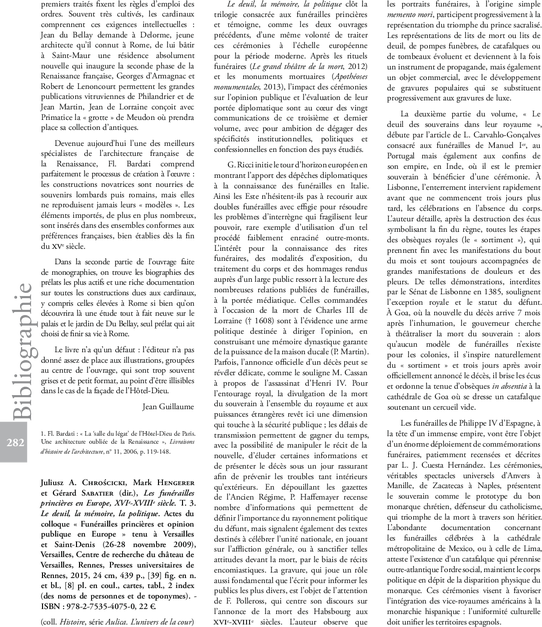 Les funérailles princières en Europe, XVIe-XVIIIe siècle : apothéoses monumentales (publicación tras el coloquio internacional de los 26, 27 y 28 de noviembre de 2008 en Versalles y Saint-Denis), bajo la dirección de Juliusz A. Chrościcki, Mark Hengerer y Gérard Sabatier, coedición Centre de recherche du château de Versailles / Presses universitaires de Rennes (colección “Histoire”, serie “Aulica. L’Univers de la cour”), junio de 2015, 17 × 24 cm, 440 páginas, 39 il. blanco y negro, 8 planchas en color, índices, 22€ (ISBN: 978-2-7535-4075-0).