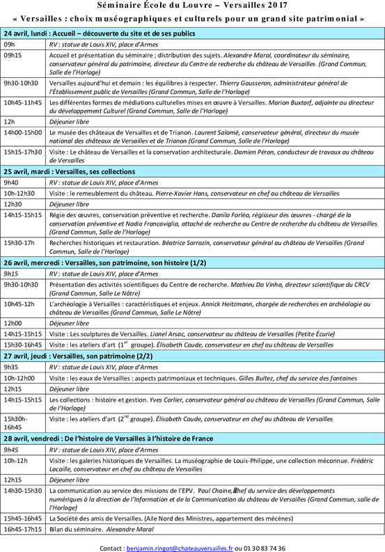 Destiné à une vingtaine d’élèves de l’École du Louvre, ce séminaire alterne exposés de spécialistes et visites du site de Versailles sur le thème « Versailles : choix muséographiques et culturels pour un grand site patrimonial ».