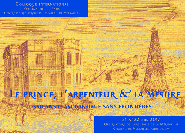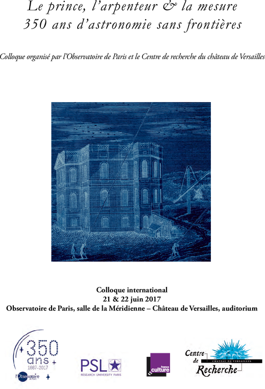 An international interdisciplinary colloquium “The Prince, the Surveyor, and the Measure” will be held on 21-22 June 2017 in the Observatoire de Paris and in the Centre de Recherche du château de Versailles, to commemorate the 350th anniversary of the founding of the Observatoire— as well as of the drawing of its Meridian Line on solstice day, 21 June 1667. The event furnishes an opportunity to examine the political and courtly context of the foundation, and the dissemination of a Parisian model of academies and observatories throughout Europe in the following two centuries.
