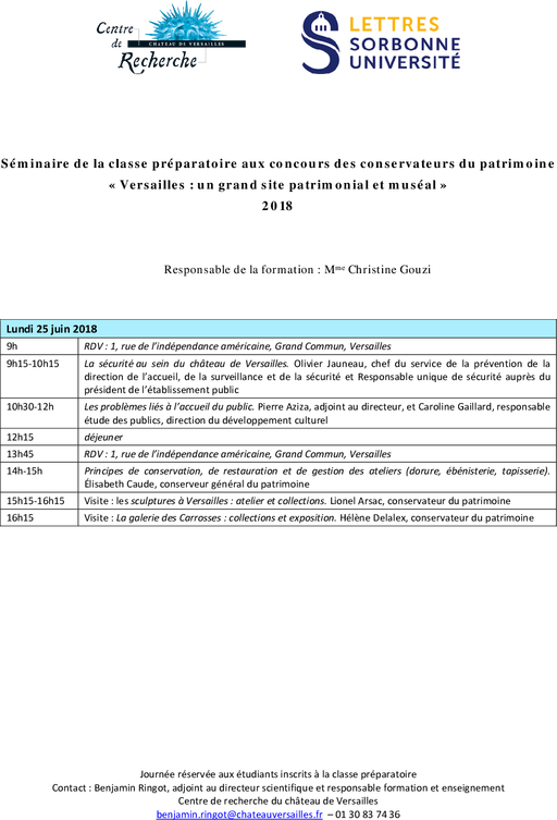 Organisé pour une vingtaine d’élèves de la classe préparatoire au concours des conservateurs du patrimoine de Sorbonne Université, ce séminaire dirigé par Christine Gouzi, maître de conférences en histoire de l’art moderne, alterne exposés et visites menés par des spécialistes sur le thème : « Versailles : un grand site muséal et patrimonial ».