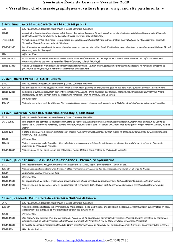 Destiné à une vingtaine d’élèves de l’École du Louvre, ce séminaire alterne exposés de spécialistes et visites du site de Versailles sur le thème « Versailles : choix muséographiques et culturels pour un grand site patrimonial ».