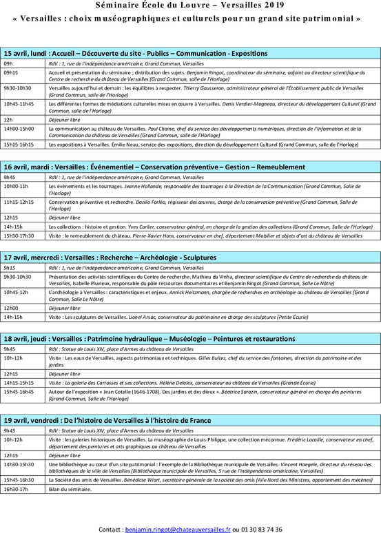 Destiné à une vingtaine d’élèves de l’École du Louvre, ce séminaire alterne exposés de spécialistes et visites du site de Versailles sur le thème « Versailles : choix muséographiques et culturels pour un grand site patrimonial ».