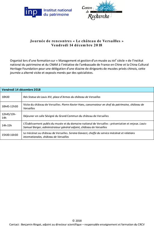 Concernant une délégation d’une dizaine de dirigeants de musées privés chinois, en présence de Mme Sophie Seyer, secrétaire générale, et de M. Olivier Zeder, directeur des études du département des restaurateurs de l’INP, cette journée fermée au public s’est déroulée à Versailles le vendredi 14 décembre 2018 et a proposé une visite et des exposés menés par des spécialistes :