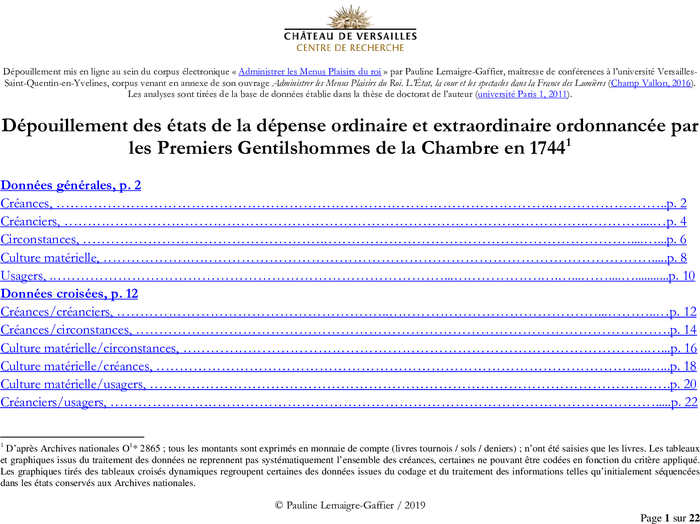 Tous les montants sont exprimés en monnaie de compte (livres tournois / sols / deniers) ; n’ont été saisies que les livres. Les tableaux et graphiques issus du traitement des données ne reprennent pas systématiquement l’ensemble des créances, certaines ne pouvant être codées en fonction du critère appliqué. Les graphiques tirés des tableaux croisés dynamiques regroupent certaines des données issues du codage et du traitement des informations telles qu’initialement séquencées dans les états conservés aux Archives nationales.