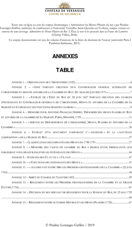 – annexe 5. – « service du département de l’argenterie, menus, plaisirs et affaires de la chambre »