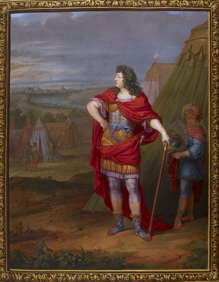 - Fol. 1 : Peinture à pleine-page représentant Louis XIV couronné par la Victoire. Non signée. A l’arrière-plan, la ville de Maastricht. D’après une peinture de Pierre Mignard, exécutée en 1673, conservée au musée du Louvre, provenant des collections de Louis XIV.