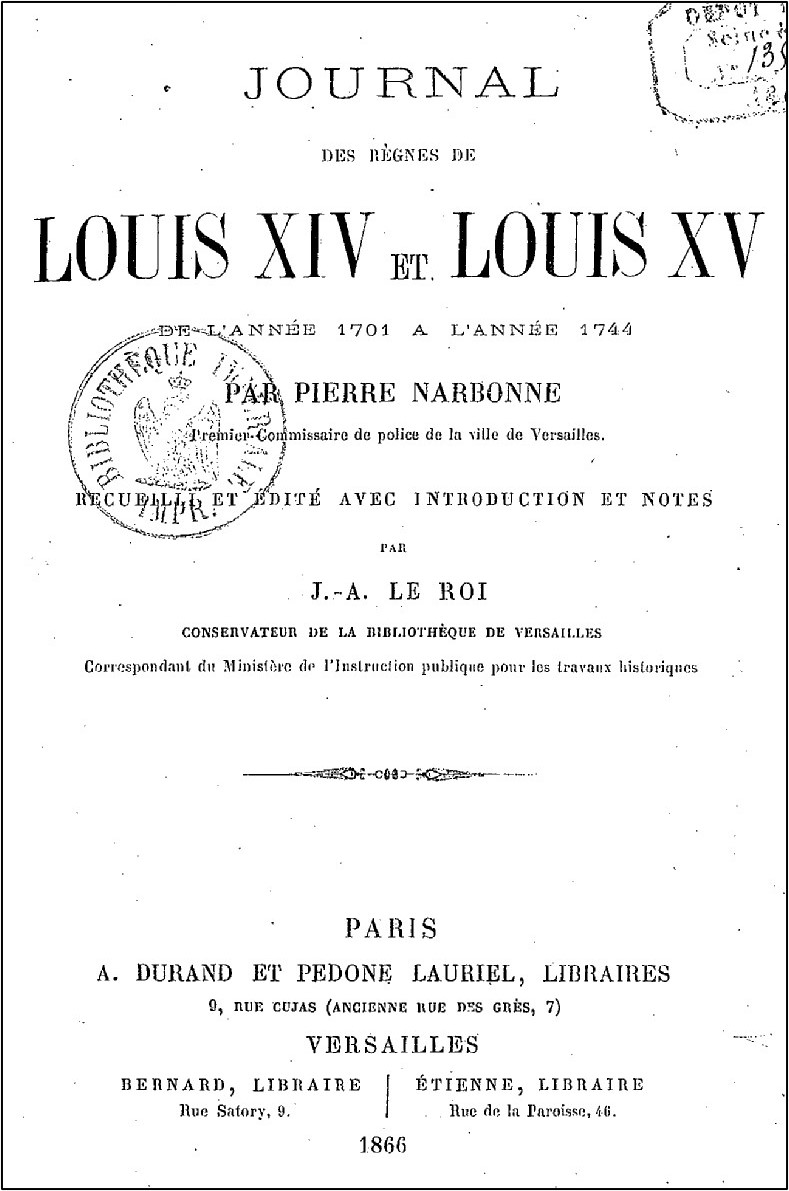 Narbonne (Pierre), Journal des règnes de Louis XIV et Louis XV : de l’année 1701 à l’année 1744, recueilli et édité avec introduction et notes par Joseph-Adrien Le Roi, Paris, A. Durand et Pedone Lauriel, Versailles, Bernard et Étienne, 1866.