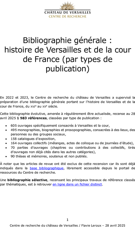 En 2022 et 2023, le Centre de recherche du château de Versailles a supervisé la préparation d’une bibliographie générale portant sur l’histoire de Versailles et de la cour de France, du XVIe au XXe siècle.