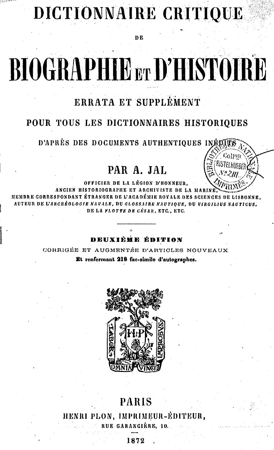Jal (Auguste), Dictionnaire critique de biographie et d’histoire. Errata et supplément pour tous les dictionnaires historiques d’après des documents authentiques inédits, 2e édition corrigée et augmentée d’articles nouveaux, Paris, H. Plon, 1872 (1re éd. 1867 ; reproduction en fac-similé, Genève, Slatkine reprints, 1970, 2 volumes).