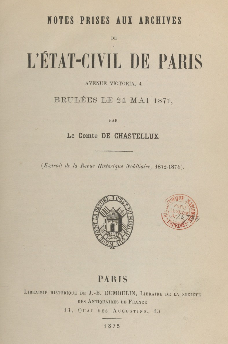 Chastellux (Henri-Paul-César de), Notes prises aux archives de l’état-civil de Paris, avenue Victoria, 4, brûlées le 24 mai 1871, Paris, J.-B. Dumoulin, 1875.