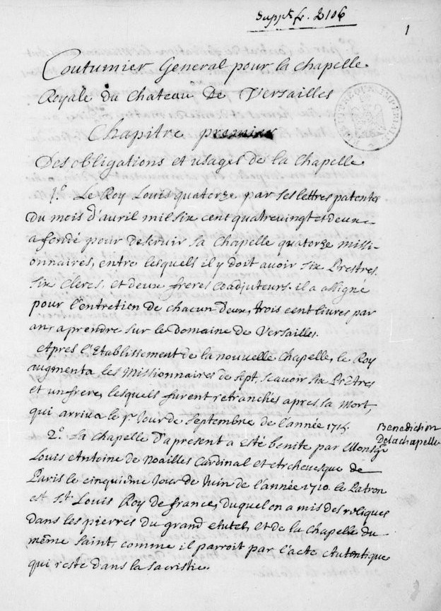 Bibliothèque nationale de France, département des Manuscrits, Français 14453 : « Coutumier général pour la Chapelle royale du Château de Versailles », XVIIIe siècle. Papier, 33 pages, 11 et 8 feuillets, 210 × 145 mm, cartonné. Microfilmé sous la cote MF 34438.