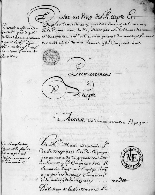 « Estat au vray des recepte et despence tant ordinaire qu’extraordinaire de la maison de la Reyne mere du Roy faictes par Mr Estienne Jeannot de Barthillat [...] »
