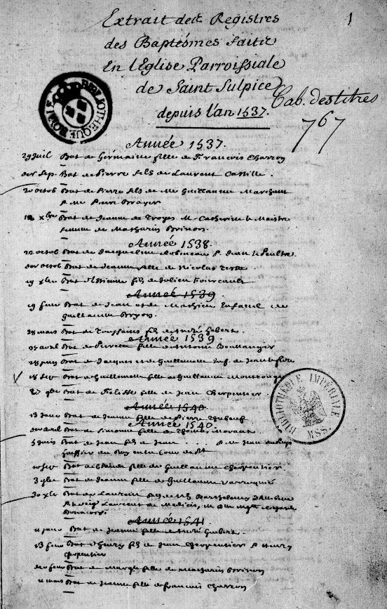 - Extrait des registres des baptêmes, mariages, sépultures, etc. faits en l’église paroissiale de Saint-Gervais, 1531-1712 (Bibliothèque nationale de France, Département des manuscrits, Français 32838).