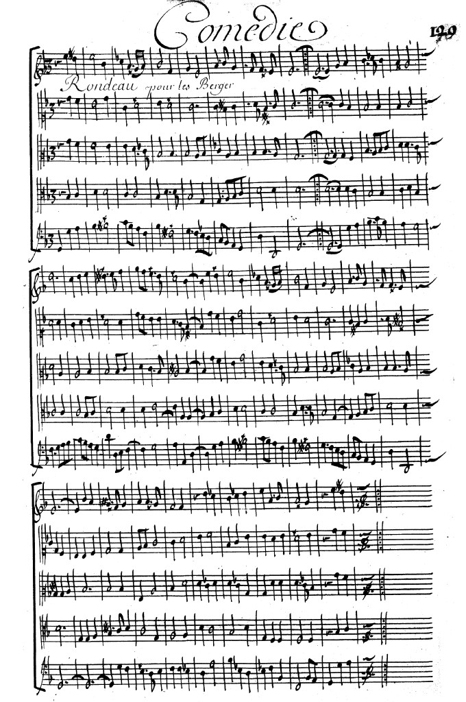 Lully (Jean-Baptiste), George Dandin ou le Grand Divertissement Royal de Versailles, dancé devant Sa Majesté, éd. par A. Philidor, 1690, p. 129, Bibliothèque nationale de France, Département Musique, RES F-526.