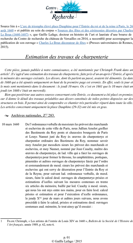 - Z/1/J 283, 10 mars 1660 (prisée des ouvrages de charpenterie exécutés pour l’Entrée).