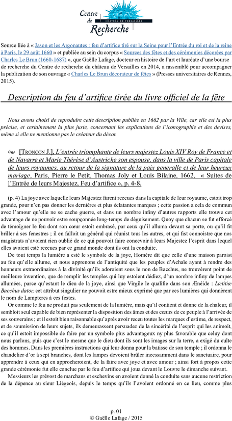 [TRONÇON Jean], L’entrée triomphante de leurs majestez Louis XIV Roy de France et de Navarre et Marie Thérèse d’Austriche son espouse, dans la ville de Paris capitale de leurs royaumes, au retour de la signature de la paix generalle et de leur heureux mariage, Paris, Pierre le Petit, Thomas Joly et Louis Bilaine, 1662, « Suites de l’Entrée de leurs Majestez », « Feu d’artifice », p. 4-8.