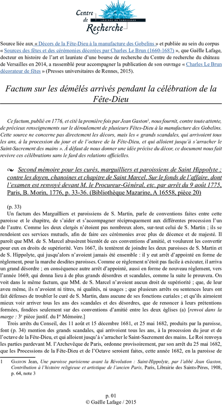 Second mémoire pour les curés, marguilliers et paroissiens de Saint Hippolyte ? ; contre les doyen, chanoines et chapitre de Saint Marcel. Sur le fonds de l’affaire, dont l’examen est renvoyé devant M. le Procureur-Général, etc. par arrêt du 9 août 1775, Paris, B. Morin, 1776, p. 33 ?36 (Bibliothèque Mazarine, A 16558, pièce 20).