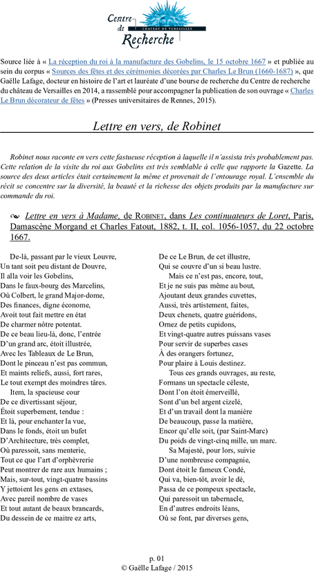 Lettre en vers à Madame, de Robinet, dans Les continuateurs de Loret, Paris, Damascène Morgand et Charles Fatout, 1882, t. II, col. 1056-1057.