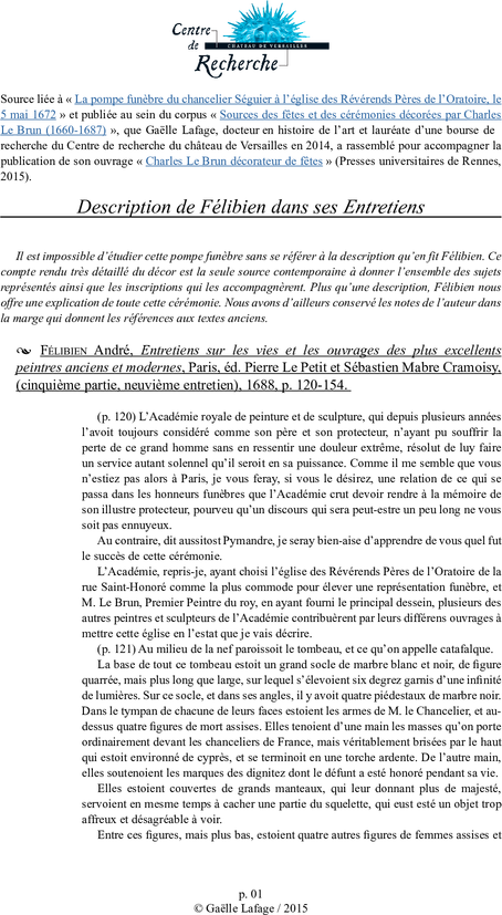 GUILLET DE SAINT-GEORGES Georges, « Mémoire historique des principaux ouvrages de Charles Le Brun », dans Mémoires inédits sur la vie et les ouvrages des membres de l’Académie royale de Peinture et Sculpture, publiés d’après les manuscrits conservés à l’École impériale des Beaux-Arts, éd. par Philippe de Chennevières, Louis Dussieux, Paul Mantz, Anatole de Montaiglon, Eudore Soulié, Paris, J.B. Dumoulin, 1854, t. I, p. 29.