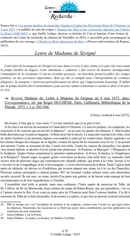 SÉVIGNÉ Madame de, Correspondance, éd. par Roger Duchêne, Paris, Gallimard, Bibliothèque de la Pléiade, 1972, vol. 1, p. 502-504.