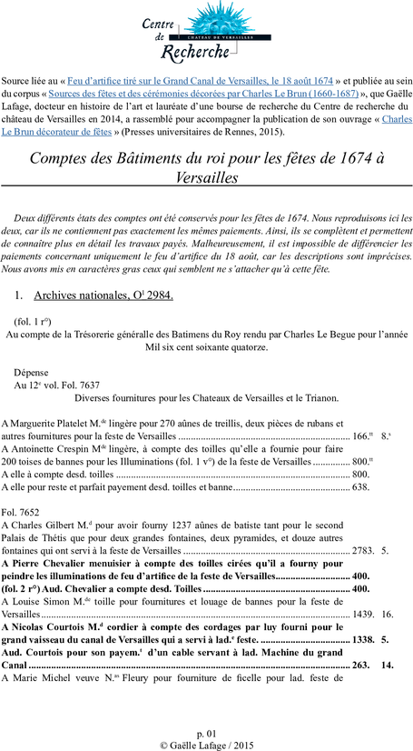 - O/1/2984 : Comptes des Bâtiments du roi pour la fête de 1674 à Versailles.