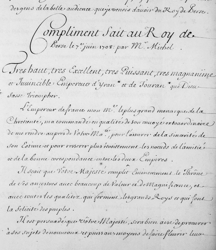 « Compliment fait au Roy de Perse le 7e juin 1708 par Mr Michel »
