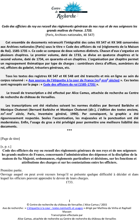 Cet ensemble de documents retranscrit l’intégralité des cotes KK 547 et KK 548 conservées aux Archives nationales (Paris) sous le titre « Code des officiers du roi (règlements de la Maison du Roi). 1585-1735 ». Ce code se compose de deux volumes distincts. Chacun d’eux s’organise en plusieurs chapitres. Le premier volume, daté de 1733, se divise en quatorze chapitres et le second volume, daté de 1734, en quarante-et-un chapitres. L’organisation par chapitre permet un regroupement thématique par type de charges : contrôleurs clercs d’offices, aumôniers du roi, officiers du gobelet, trésoriers généraux, etc.