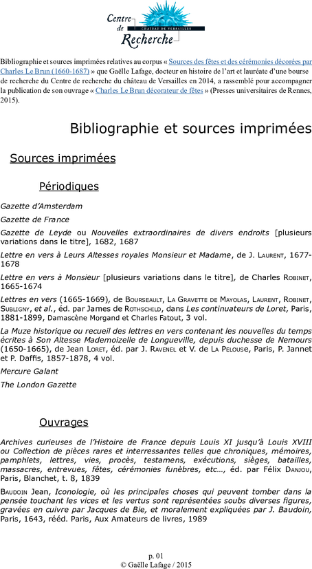 Plus spécifiquement, ce corpus est issu d’une thèse de doctorat intitulée « Charles Le Brun décorateur de fêtes et de cérémonies », que Gaëlle Lafage a soutenue à l’université Paris-Sorbonne – Paris IV en 2013, sous la double direction de MM. Jérôme de La Gorce (CNRS) et Alain Mérot (Paris-Sorbonne – Paris IV).