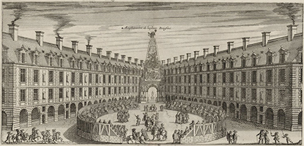 Jean Marot, Place Dauphine avec l’amphithéâtre et l’arc de triomphe, estampe, 184 × 382 mm, Bibliothèque nationale France, département des Estampes et de la Photographie, Hennin, 3994. © BnF