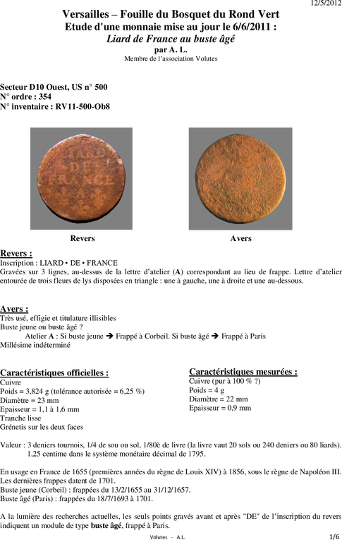 Excavación del bosquete del Círculo Verde: estudio de una moneda: Liard de France con busto de mayor por A. L. (en francés):